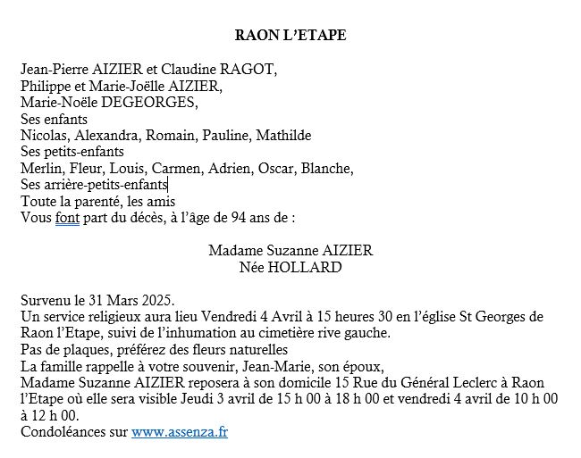 Décédée à Saint Dié (88100, France) le lundi 31 mars 2025 à l'âge de 94 ans