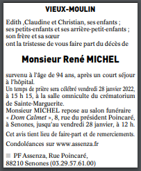Décédé à Saint Dié (88100, France) le lundi 24 janvier 2022 à l'âge de 94 ans