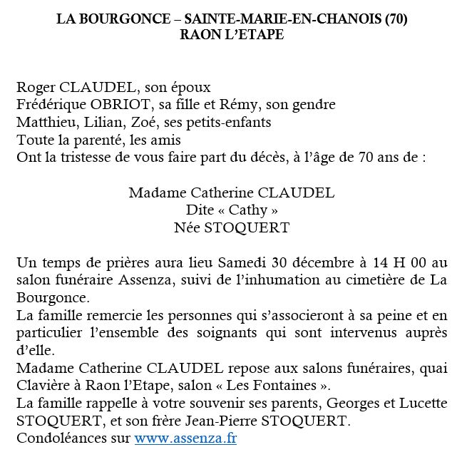 Décédée à Saint Dié (88100, France) le mercredi 27 décembre 2023 à l'âge de 70 ans